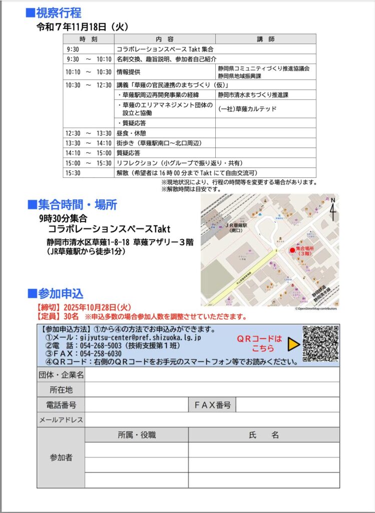 このたび、静岡県交通基盤部様が主催する視察・勉強会の視察先として、草薙周辺地区および草薙カルテッドを選んでいただきました。