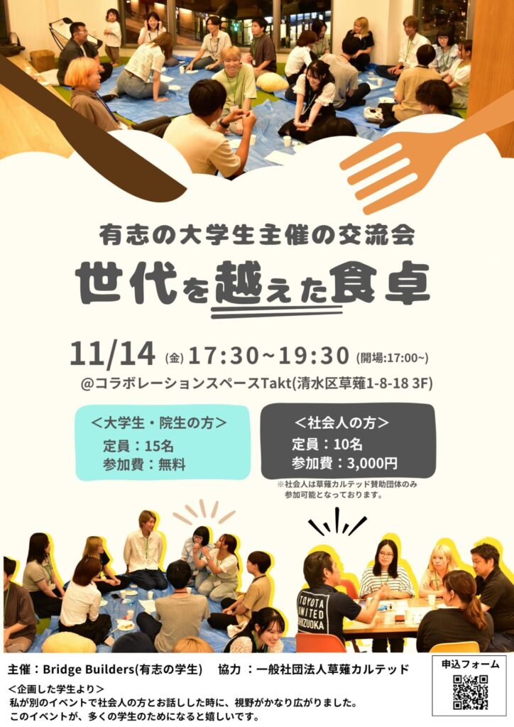 本イベントは、世代の垣根を越えて、学生と社会人がフラットに対話できる場を目指して立ち上がった交流イベントです。毎回違った学生が主催となり、企画・運営を行なっております。