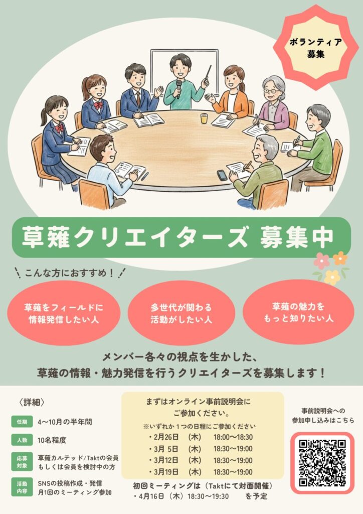 「草薙クリエイターズに参加したい」「詳しくお話が聞きたい」という方は、以下の事前説明会にお気軽にご参加ください。
